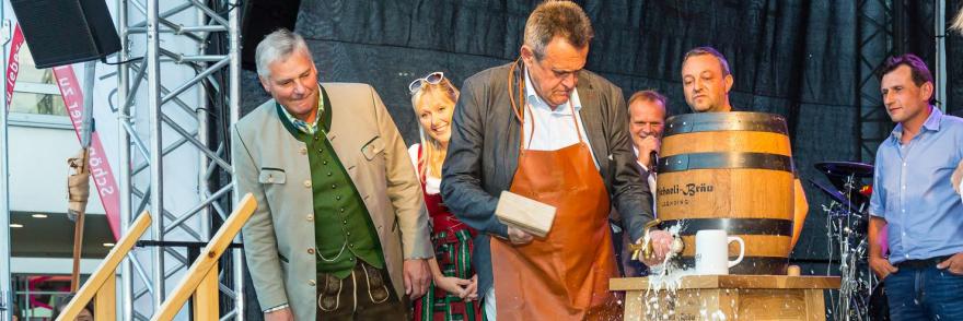 Festreden, Interviews mit Politikern. Jaja Wahlzeit isch. Und dann pünktlich um 18:55 legt der Oberbürgermeister von Leonding, Walter Brunner den Lederschurz um die Lende, hebt den 900 Gramm schweren Holzhammer an, um dann mit drei Schlägen das Holzfass ganz souverän „bayrisch anzuzapfen“. Das Festbier – ein Michaeli Zwickl wird den Ehrengästen in Tonkrügen kredenzt.